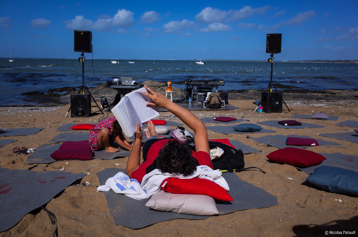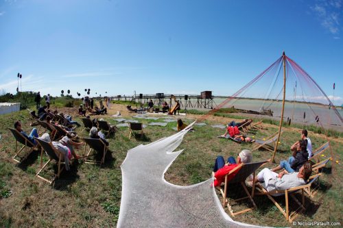 • Le site central : Au bord de l’eau, une petite scène, des musiciens… Le temps d’une sieste, le public s’installe dans des transats, contemple les paysages et se laisse bercer au son d’une harpe, d’un violoncelle, d’une création sonore d’inspiration aquatique… A proximité, un espace scénographié permet de recevoir les passants et de les orienter, un petit bar permet de se désaltérer. Depuis ce lieu, le public peut rayonner vers les différentes propositions artistiques installées dans les pêcheries.